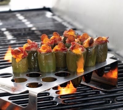 Cut off stem end of the jalapeños and remove the seeds, using the jalapeño corer included with your rack. Be careful not to touch your eyes or face, as the pepper juice can sting. It may help to wear latex gloves to protect your hands. Slice the cheese into uniform sticks just big enough to fit in each jalapeño, and roll each cheese stick with an almond in a slice of bacon. Stuff the wrapped cheese stick into each jalapeño and arrange on the jalapeño rack. Grill the jalapeños by indirect heat at a moderate temperature (about 375ºF/190ºC) until the peppers are tender and lightly browned, about 20 to 30 minutes. For spicier poppers, cook a few minutes less. Enjoy piping hot!