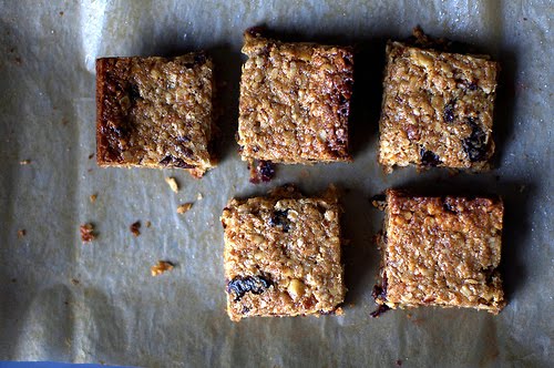 Stir together all the dry ingredients, including the fruit and nuts. In a separate bowl, whisk together the vanilla, melted butter or oil, liquid sweeteners and water. Toss the wet ingredients with the dry (and peanut butter, if you’re using it) until the mixture is evenly crumbly. Spread in the prepared pan, pressing them in firmly to ensure they are molded to the shape of the pan. (A piece of plastic wrap can help with this, as you press down on the back of it.)
