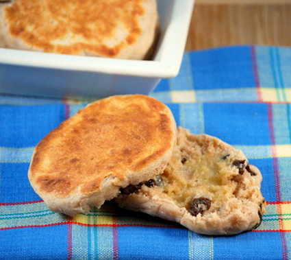 English muffins don’t come in with too many flavor options beyond plain and sourdough, although whole wheat do seem to pop up more and more often these days. The one real flavor that english muffins come in is cinnamon raisin – and it’s a good one. When the spicy muffins toast up, the cinnamon scent and flavor is released from the bread and the raisins become hot and sweet. They’re not as versatile as the go-with-anything plain variety of english muffin, but when they’re spread with butter, cinnamon raisin is a fantastic breakfast treat. These are very easy to make at home. The english muffin dough is a no-knead batter that is mixed up and allowed to rise for just a short period of time. Once it has risen, the dough is dropped in big spoonfuls and cooked on a skillet or griddle. This allows both the top and the bottom of the muffin to take on a golden color, while the center cooks through and still remains chewy and soft, the perfect texture for toasting. This recipe calls for nonfat milk because it tends to produce slightly holier muffins. The higher the fat content in the english muffin, the tighter the crumb. Low fat milk works pretty well, but if you compared a whole milk muffin and a nonfat muffin, you’d notice a difference. All that said, both will taste good. If you want to experiment a little, try using other dried fruits in place of the raisins, like currants, cranberries or blueberries.