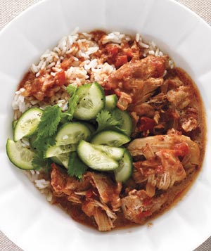 Just before serving, stir the cream into the chicken tikka masala. Serve over the rice with the cucumber relish.