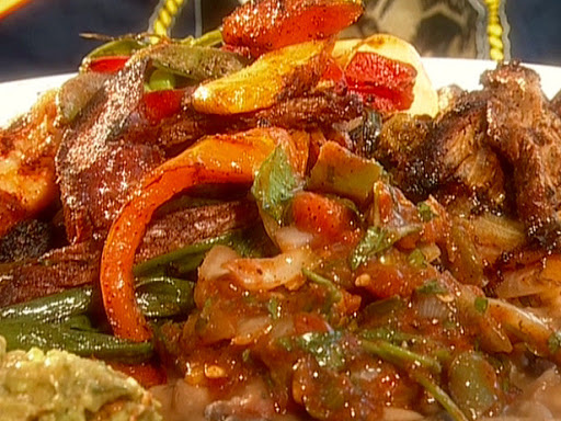Heat the same large skillet until very hot and return the vegetables to the pan. Layer the assorted roasted chiles on top and then lay the meat on top of the chiles. Add the lime juice for that famous fajita sizzle and serve immediately with the guacamole and salsa.