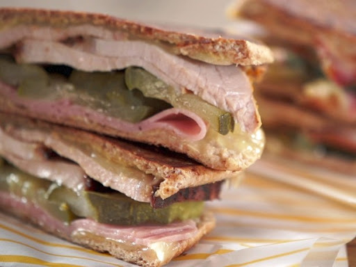 Let the pork rest as you prepare the buns. Spread some of the mustard onto each sandwich thin, and top with 2 pickle slices, 1 slice ham and 1 slice cheese. Spread about 1 teaspoon of the reserved garlic mixture onto the top sandwich thin. Carve the pork loin into 1/2-inch slices and place 2 slices onto each sandwich. Assemble the sandwiches with the top bread thins.