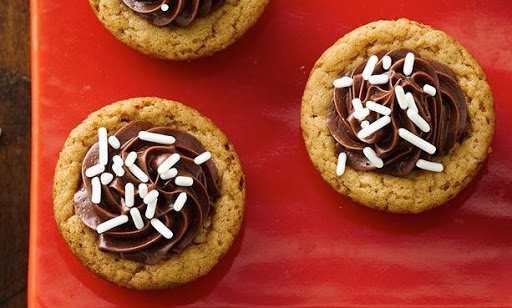3 Bake 9 to 11 minutes or until edges are light golden brown. Cool completely in pan, about 30 minutes. Remove from pan to serving plate. Spoon frosting into pastry bag fitted with star tip. Pipe frosting on top of each cookie cup. Decorate with decors.