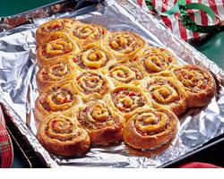 Spread half of sausage mixture evenly over each rectangle; starting from a narrow end, roll up jelly roll-style. Cut each roll into eight equal slices and place on its side on a baking sheet to form a Christmas tree (see photo).