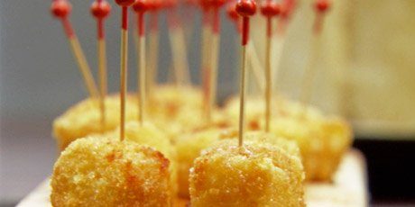 Coat the cheese cubes in the flour, then egg, then Panko crumbs, then deep-fry until crisp and golden.