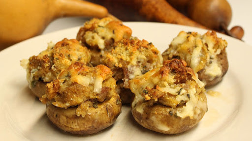 4) Stuff the mushroom caps and top each mushroom with a mix of white sharp cheddar, Parmigiano Reggiano and finely chopped fresh sage.