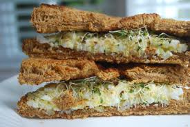 Arrange bread in a single layer on work surface. Spread 1/4 of the egg mixture on 4 slices of bread. Top egg mixture on each slice of bread with an equal amount of sprouts. Top with remaining 4 slices of bread.