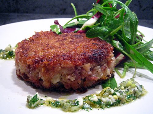 9 .- Vierta una porción generosa de salsa Gribiche sobre cada una de los 6 platos. Colocar una tortita de pata frita en cada plato y adorne cada uno con la ensalada condimentada.