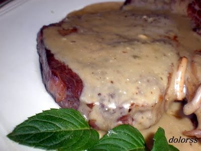 Fundir la manteca y saltear los champignones cortados por la mitad. Verter la salsa demi-glace y agregar la crema de leche. Agregar el queso azul y fundir en la salsa. Por último añadir el brandy, sal y pimienta.