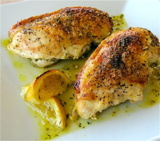 The scented oil is then poured into a baking dish, de-boned, but skin on chicken breasts are placed on top of the lemon-garlic mixture and are brushed with more olive oil before receiving a final sprinkle of salt and pepper. For good measure and to ensure even more flavor a cut up lemon is tucked in between all of the meat into to the pan before baking. After a baking time of around 40 minutes, you are left with incredibly moist pieces of chicken and a sauce that is to die for.