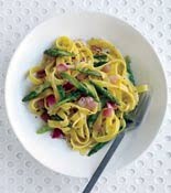 Meanwhile, in a large pot of boiling, salted water, cook the asparagus until crisp-tender, about 2 minutes. Remove with a strainer and refresh in cold water; drain. Add the pasta to the pot and cook until al dente; drain, reserving 1/2 cup of the pasta cooking water. Reserve the pot.