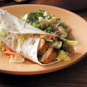 Nutrition Facts: 1 wrap equals 290 calories, 8 g fat (1 g saturated fat), 37 mg cholesterol, 430 mg sodium, 32 g carbohydrate, 2 g fiber, 23 g protein. Diabetic Exchanges: 3 lean meat, 2 starch, 1/2 fat.