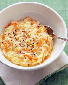 2.In a large saucepan, melt 1 tablespoon butter over medium. Add onion and carrots; season with salt and pepper. Cook, stirring occasionally, until softened, 5 to 7 minutes. Stir in rice. Add wine; cook, stirring, until absorbed, 1 to 2 minutes.
