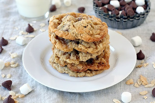 Beat butter with sugars. Add eggs one at a time, then add vanilla. Beat in flour, baking soda and baking powder. Fold in oats, cereal, morsels and marshmallows.