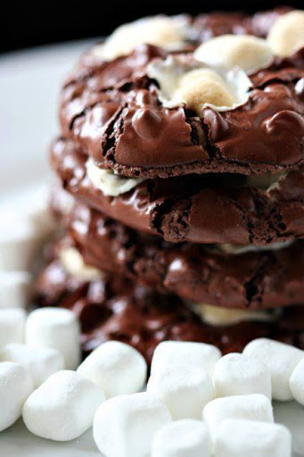 Use a small ice cream scoop to portion out small mounds on to the parchment paper, then top each cookie with 4-5 marshmallows. Pop into the freezer for 5 minutes to chill slightly (this prevents them from spreading too much in the oven).