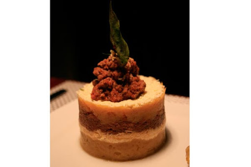 Cocinar el plátano que esté bien maduro, triturarlo con un tenedor, salpimentarlo, colocarle la mantequilla y reservar, aparte sofreír la cebolla, colocar la albahaca, y sofreír la carne de res molida, agregar la pasta de tomate, el vino, el fondo de ave y dejar reducir, salpimentar al gusto. Para la presentación coloque en un aro metálico un poco del puré de plátano maduro, luego un poco de queso cuajada, luego una capa de carne y repita nuevamente el proceso. Finamente decore con una hoja de albahaca frita.