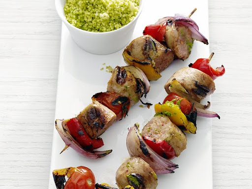Toss the couscous with half of the remaining pesto and season with salt and pepper. Serve with the skewers and the remaining pesto, for dipping.