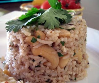 Grind the spices in a mortar and pestle or spice grinder. Heat the oil in a deep lidded pan over a medium heat and add the spices and garlic. Stir for a few minutes until aromatic then add the nuts. Stir ‘til the nuts are slightly golden then add the rice, stirring to coat with the oil and spice mixture for a few minutes. Add the chicken stock and bring to a simmer. Cover and simmer 10-12 minutes then remove the lid, fluff the rice with a fork, replace the lid and let stand 5 minutes. Stir through the coriander and serve.