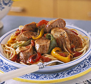 Choose sweet or hot turkey sausage to roast with the sweet peppers, onion, fennel, and tomato. Serve the delicious medley over spaghetti.