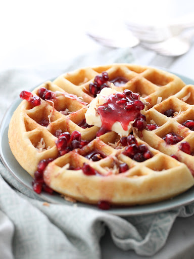 Coconut Waffles with Pomegranate Syrup…Or Ice Cream