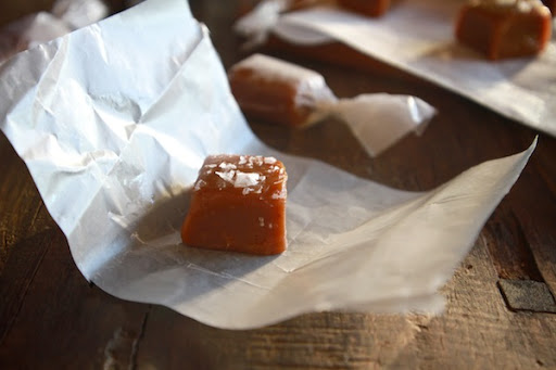 Remove pan from heat and whisk in sweetened condensed milk and butter (mixture will bubble vigorously) until smooth. Fit pan with candy thermometer and return to medium-low heat. Cook, whisking constantly, until thermometer registers 240F. Remove from heat and whisk in the bourbon and kosher salt. Pour into prepared pan; let cook. Sprinkle caramel with sea salt, cut into 1 inch pieces and wrap individually in parchment paper.