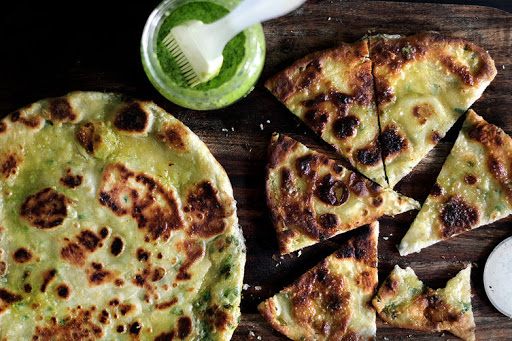 Now go back to the first dough you worked on (which has had a few minutes to rest) and press it down gently into a thick, flat disk. There will be air pockets in between the layers which will make it hard to roll out, so pierce the dough a few times with a fork and dust with only enough flour to prevent sticking, then roll into a large circle slightly thicker than 1/16 inch. (Be careful not to over-roll it because you’ll risk flattening all the layers.) If the dough springs back stubbornly, rest it for another 2 min. If you want to keep the flatbreads in the freezer, laminate the rolled-out doughs in between two sheets of parchment paper and tuck inside a zip-lock bag. Keep frozen until needed.