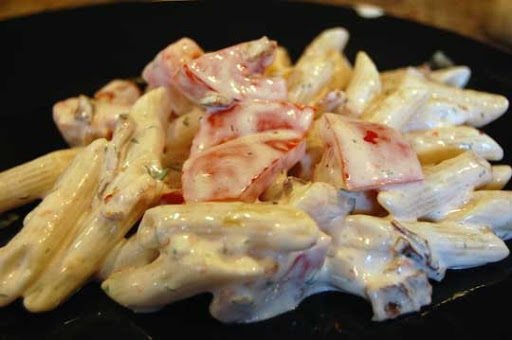 Drain the pasta and run it under cool water. Mix the pasta, tomatoes, bacon and dressing together. Refrigerate until ready to serve.