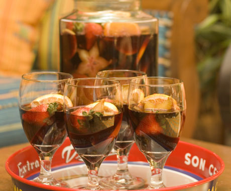 Combine citrus slices and other firm fruits in a large, nonreactive container. Add wine, liqueur, brandy, and lemon verbena. Cover and refrigerate overnight (or up to 3 days). When ready to serve, put some soft fruits into each wine glass and fill two-thirds full with the Sangria. Top off with a splash of club soda.
