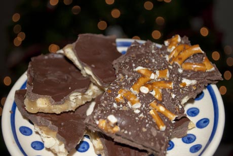 Straighten up any wayward crackers with a fork. Then immediately place this in the oven for 5-6 minutes. After 5 minutes pull it out of the oven and spread the chocolate chips on top carefully, the mixture will be extremely hot.