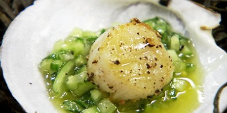 Serve up by placing your scallop shells on a platter. Place a dollop of the gazpacho on each shell and top with a single seared scallop. Add a little drizzle of olive oil and a last dusting of salt and pepper.