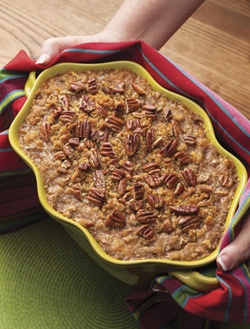 •Preheat oven to 350 degrees. Mix squash, 1/4 cup butter, eggs, milk and spices and spread into a casserole dish. Mix remaining butter, brown sugar, pecans and flour together and sprinkle over squash mixture.