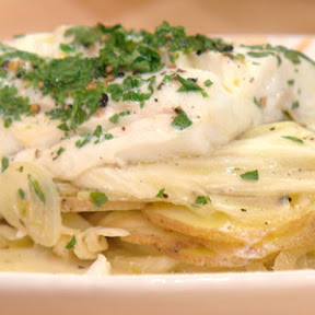 Arrange about 1/4 of fennel mixture in center of each parchment, drizzle with 2 tablespoons vermouth or wine per packet, top with fish, season fish with salt and pepper, top fish lemon juice, butter, parsley. Meet short ends at middle and fold over 1 inch, fold a few more turns than fold in ends to make half-moon shaped packets (sacks).