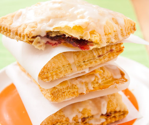First, you roll out flaky, buttery dough into a big sheet and score it into rectangles. Then, you spoon jam into the rectangles, lay another sheet of pastry dough on top, and press down to make little jam pockets. Finally, you cut the pockets apart and bake them to golden brown yumminess.