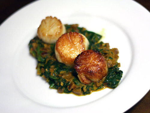 Turn off the heat for the spinach, and stir in the remaining teaspoon of garam masala and then heavy cream. Divide spinach mixture between four plates. Top each with 3 scallops. Serve immediately.