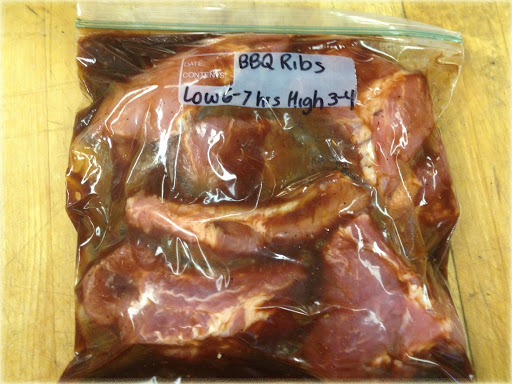Place pork ribs in gallon sized ziplock. Mix remaining ingredients together in a separate bowl and pour over ribs. Seal bag and place in freezer. Thaw over night in fridge. Cook on high for 3-4 hours or low for 6-7 hours.