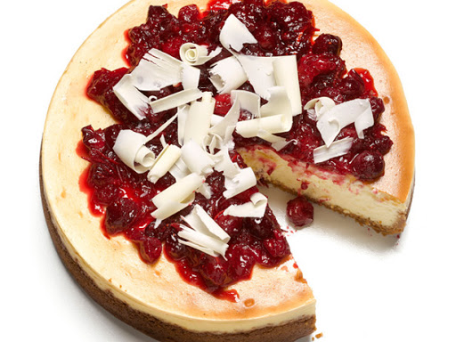 Before serving, run a hot knife around the edge of the cheesecake, then remove the springform ring. Top with the cranberry compote and shaved white chocolate.