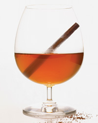 In a snifter, stir the tea with the B&B, lemon and orange juices and the honey. Garnish with the ground cinnamon, grated nutmeg and the cinnamon stick.
