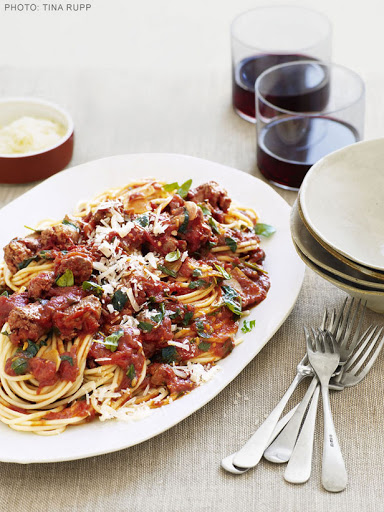 Meanwhile, cook the spaghetti in a large pot of salted boiling water until al dente. Drain, reserving 1/2 cup pasta water. Add the spaghetti, cooking liquid and reserved tomato juice to the sausage sauce and toss, about 3 minutes. Top with the pecorino and the remaining 1/2 cup basil.