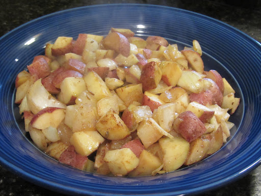 In a medium bowl, combine potatoes, onions and 1/2 tablespoon oil.