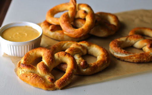 Warm up the milk in the microwave or on the stove for just about one and a half minutes. It should be about 110º. If it's too hot it will kill the yeast. You should be able to comfortably keep your finger in it. Stir in the yeast and let it sit for about 3 minutes. Add the butter and sugar. Add the flour about 1 cup at a time and the add the fine salt. Kneed for about 10 minutes with a stand mixer, or by hand. Put it in a greased bowl and cover with greased cling wrap. Let rise for 1 hour in a moist, warm place until doubled in size. Preheat the oven to 450º. Punch down dough and divide into 12 lumps (I like to divide it in half, then divide each half into three, and then divide each remaining one in half again). Roll them all out as thin as you can. Combine the warm water and baking soda in a wide bowl. Form the dough into pretzel shapes, then dip in the baking soda water. Place on a greased baking sheet and sprinkle with coarse salt. Bake for about 7-11 minutes or until browned. Dip each in the melted butter while hot. Serve with cheese sauce.