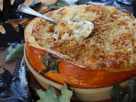 8. Turn baked pumpkin over with oven mitts. Place in large shallow baking dish or leave on baking sheet. Fill pumpkin with macaroni mixture and top with remaining cheese and breadcrumbs. (Put any mac and cheese that won’t fit in another small baking dish).