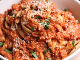 Add the tomato paste, thyme and nutmeg, and continue cooking until the vegetables have softened and started to brown, about 2 minutes. Deglaze with the wine, pulling up any bits from the bottom of the pan. Season with salt and pepper.
