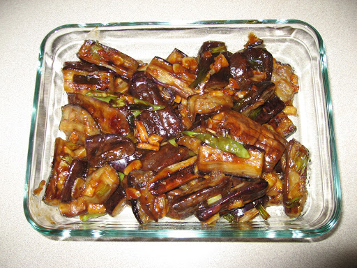 Heat 2 tbs olive oil in a skillet. Fry the eggplant pieces until they turn tender and brownish (approx 10 minutes). Remove and keep side.