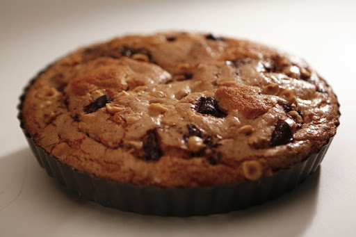 4. Pour the mixture into the prepared pan, filling the pan three-fourths of the way full. Sprinkle with the chopped chocolate and hazelnuts, as well as the granulated sugar. Bake until the torte is puffed and medium brown on top, about 35 minutes. Cool before serving.