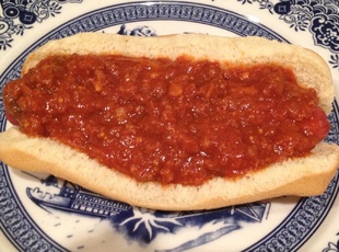 Bring to a simmer over medium heat. Reduce heat a little, stirring every 15–20 minutes. This is important to keep the mixture from browning, burning or scorching. If the mixture seems too thick, then add a little more water. (Manwich consistency is too thick. The object is to be able to spoon this on easily, but have the sauce stay on the hot dog and bun when eaten.)