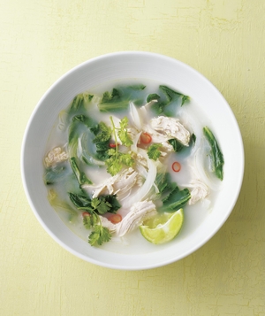 Discard the lemongrass. Transfer the chicken to a bowl and shred the meat, using 2 forks. Add the coconut milk and bok choy