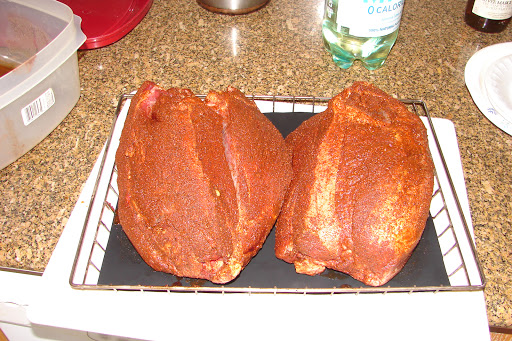 TRIM PORK ROAST AND APPLY RUB TO THE ROAST COATING IT EVENLY WITH A MED TO HEAVY COAT.