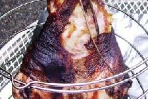 Place room temperature lamb leg in cooking basket - make sure the meat is centered and balanced - use wires or skewers to help hold in place.