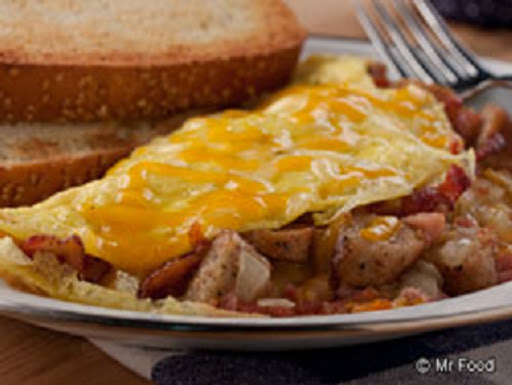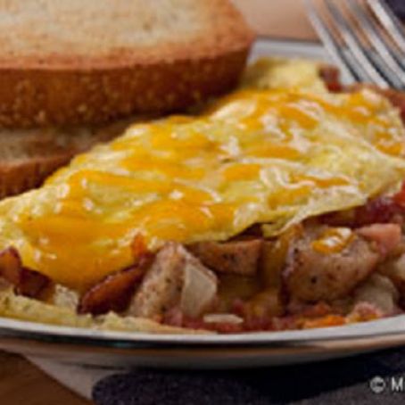 This hearty protein packed omelet featuring sausage, ham, bacon, onion and cheddar cheese is what Lumberjacks are made of!
