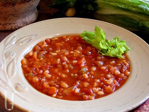 In large heavy saucepan, combine all ingredients except vegetable juice with 8 cups of water. Bring to a boil, reduce heat, cover and simmer, stirring often, for about 40 minutes or until thickened and peas, lentils and barley are tender. Stir in vegetable juice; heat through and serve.